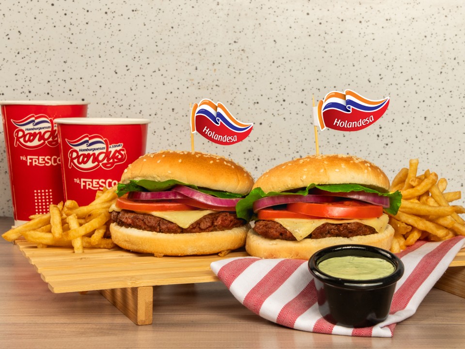 3 Hamb. Holandesas 1/4 de Libra con Queso Fundido, 3 Papas Medianas y 1 Coca Cola 1.5lt