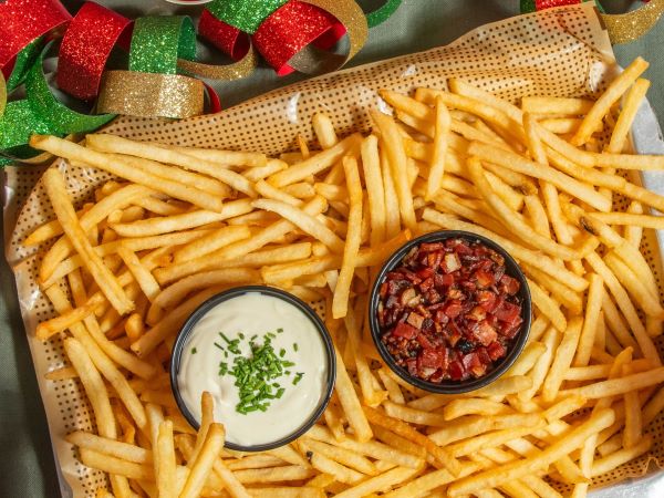 Bowl de Papas a la Francesa con Bits de Tocineta Caramelizada, Salsa de Queso y Cebollin