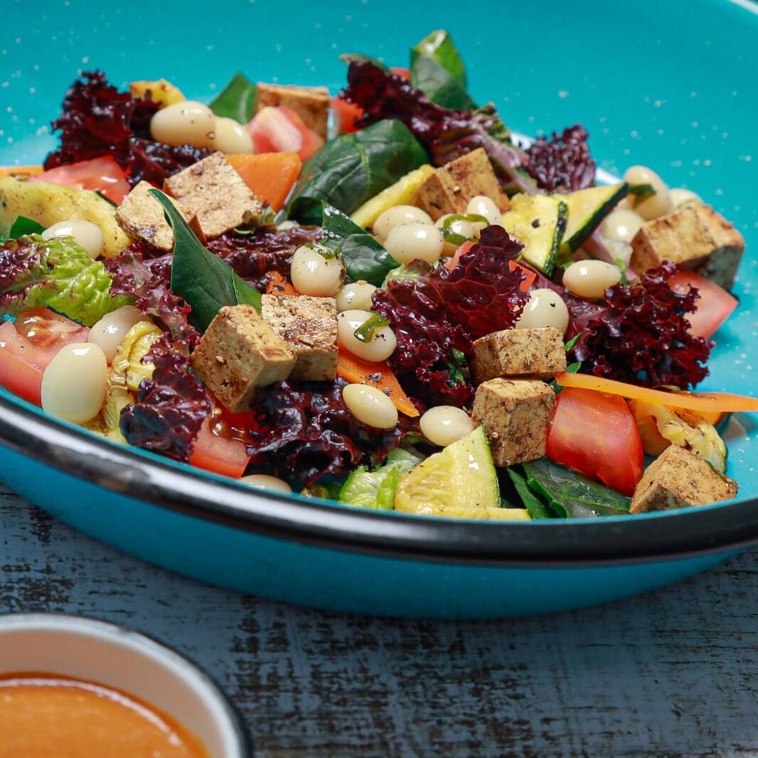 Frijol blanco encurtido, zanahorias dulces, tofu marinado, tomate fresco, calabacín asado, lechuga morada, espinaca, aderezo de pimentón asado.