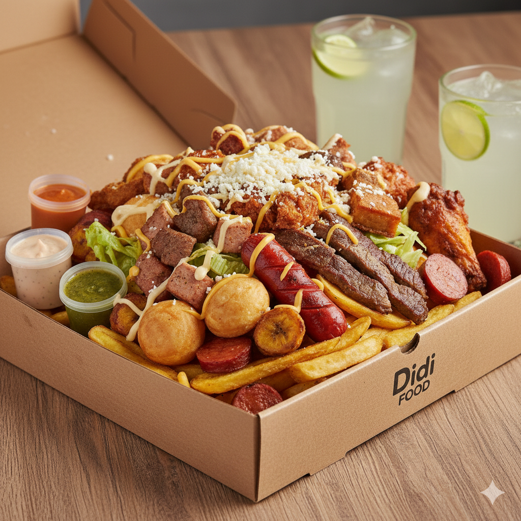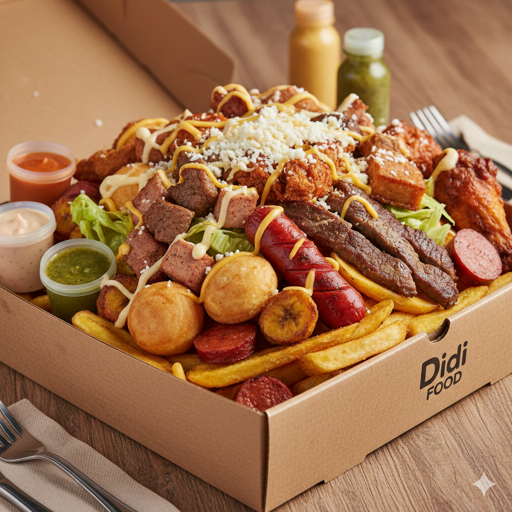 Papa artesanal, plátano, bollo de queso, salchicha americana, butifarras, chorizo, lomito de cerdo, carne de res, costillas de cerdo, alitas, chicharrón, lechuga, queso costeño, queso gratinado y salsas de la casa.