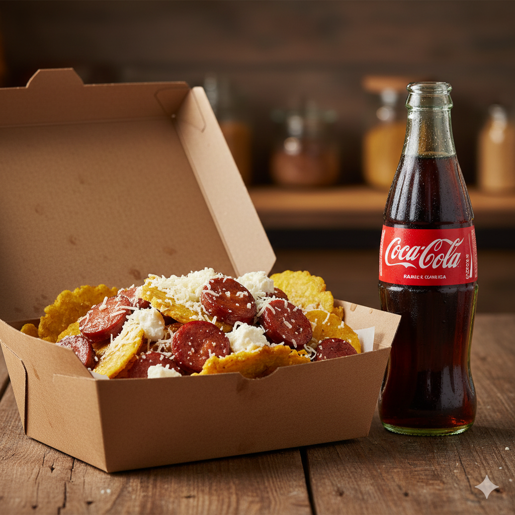 Chorizo artesanal acompañado de patacón con queso costeño o yuca cocida (a elección), con queso costeño y suero costeño más gaseosa 250 ml sabor a elegir (Coca Cola, Quatro, Colombiana, Pepsi, manzana, uva o naranja).