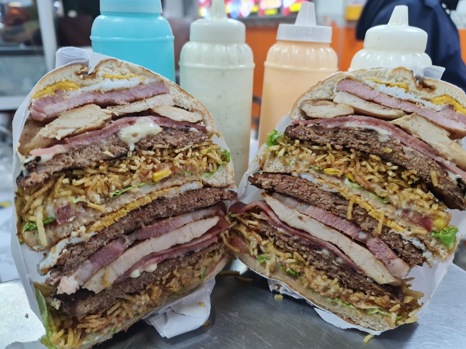 2 Carnes de hamburguesa, 2 queso mozzarella, 2 queso amarillo, 2 tocinetas, tomate y lechuga.