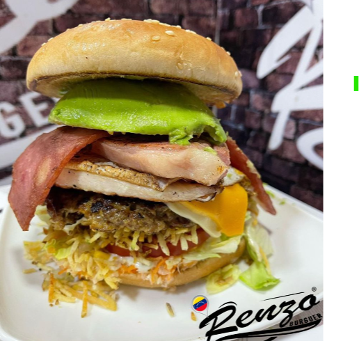 3 Carnes de hamburguesa, queso de mano, queso amarillo, queso mozzarella, tocineta, huevo, maíz, tomate, lechuga, repollo, zanahoria, papa francesa con tocineta y maíz.