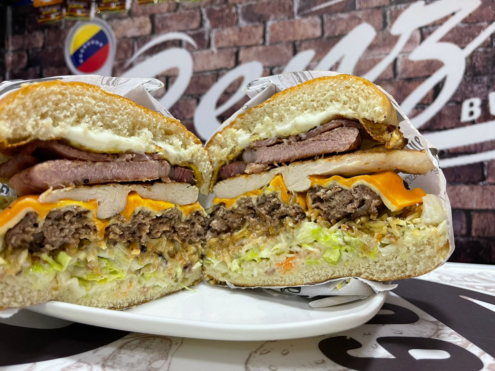 3 Carnes de res, 2 pollos, 2 chuletas, queso amarillo, queso blanco, maíz, tocineta, huevo, tomate, lechuga, repollo, zanahoria, papas chips y 3 capas de pan.