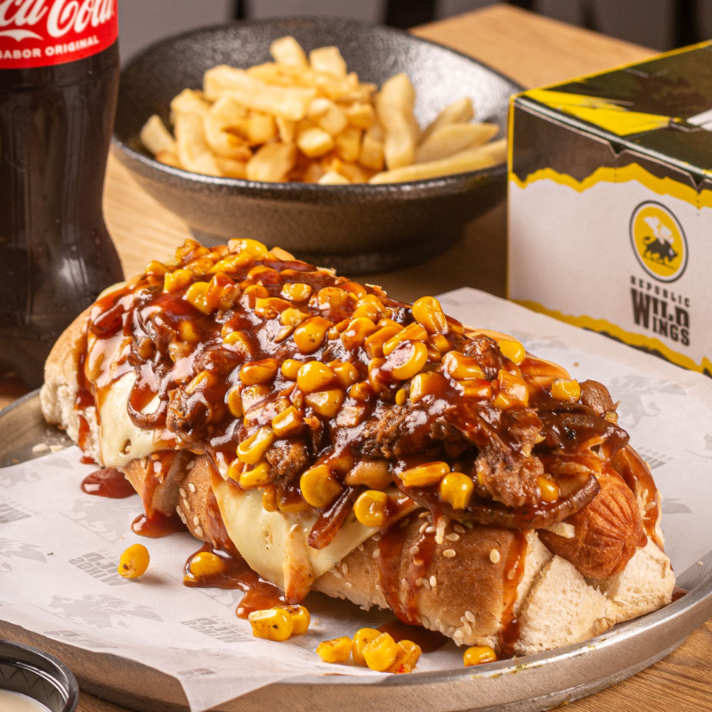 Pan brioche, carne de res, pollo, doble queso queso mozzarella, maíz tierno, trozos de tocineta y cebolla caramelizada y nuestra deliciosa salsa de la casa.