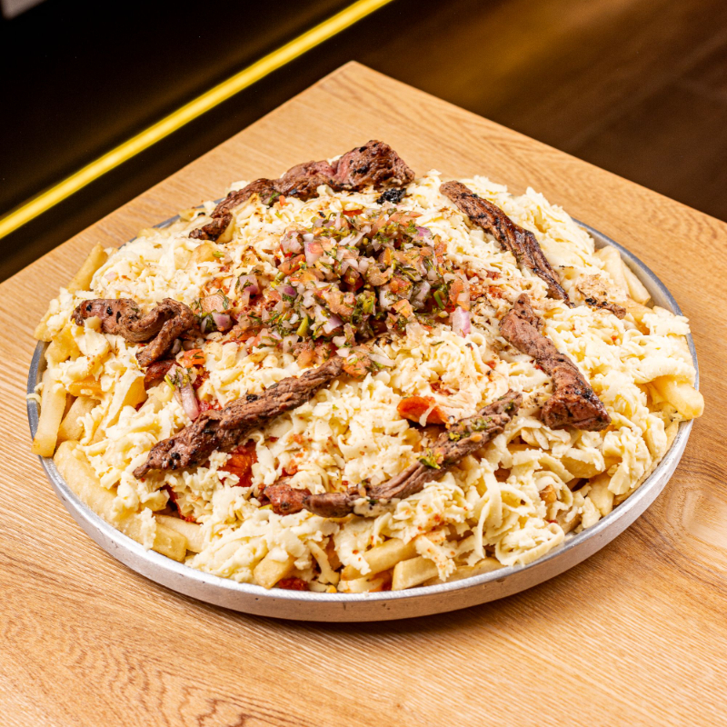 Mix de papa criolla y francesa, salchicha americana, carne en trozos, pico de gallo, queso mozzarella y salsa de la casa.