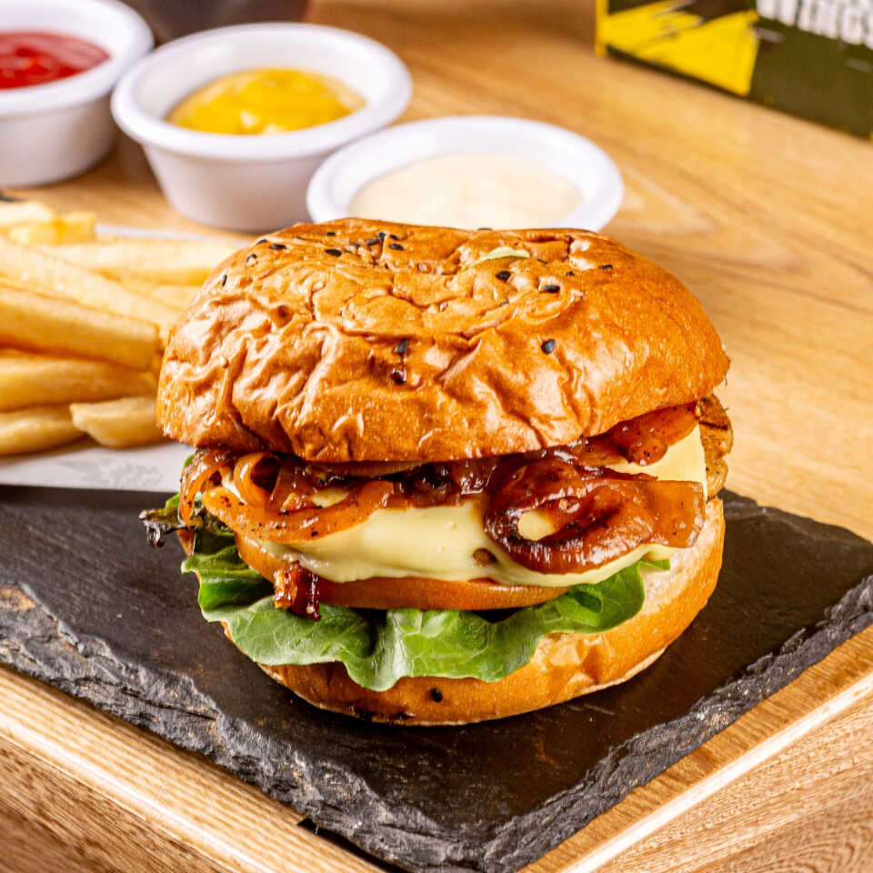 Pan brioche, carne 100% artesanal 125g. queso americano, tocineta, cebolla caramelizada, salsa bbq