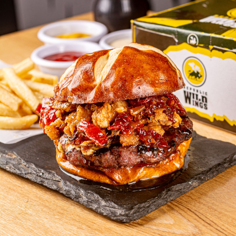 Pan brioche, doble carne 100% artesanal 125g. doble porción de tocineta, doble queso americano, cebolla morada y nuestra deliciosa salsa búfalo.