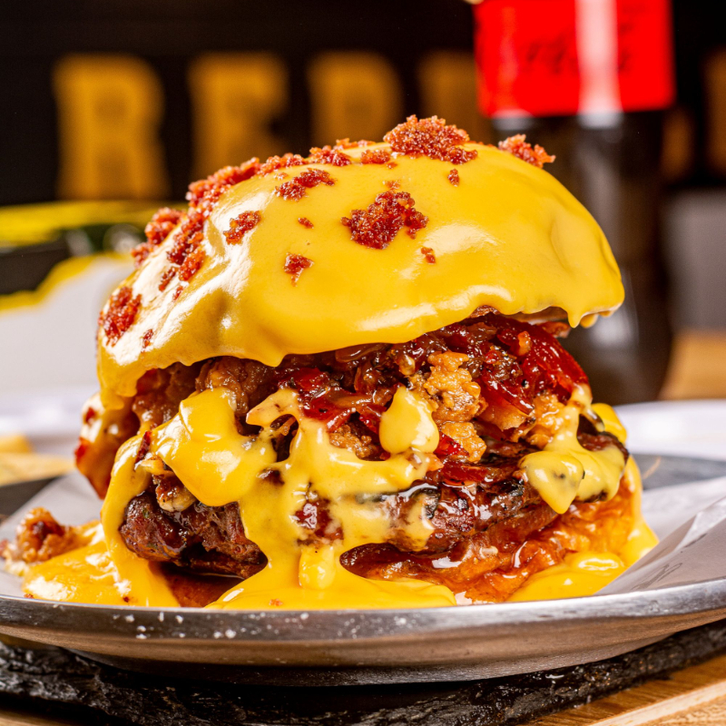 Pan pretzel, carne 100% artesanal 125g, cebolla crispy, salsa bbq, bañada en salsa de queso y tocineta.