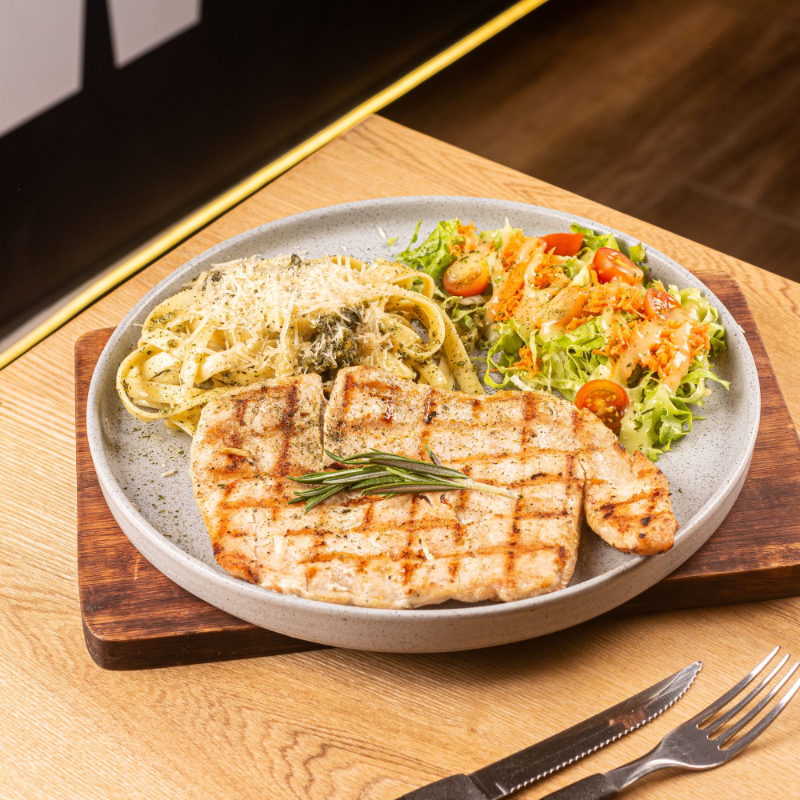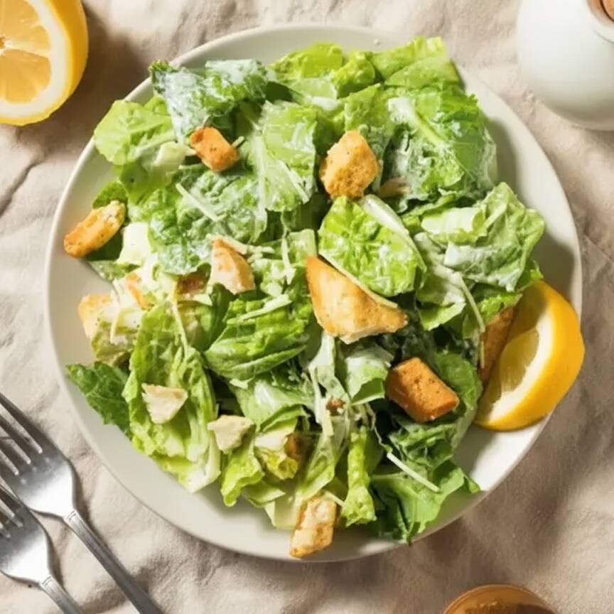 Crutones, tomate Cherry, mix de lechugas, aderezo cesar, pechuga a la plancha y queso parmesano.