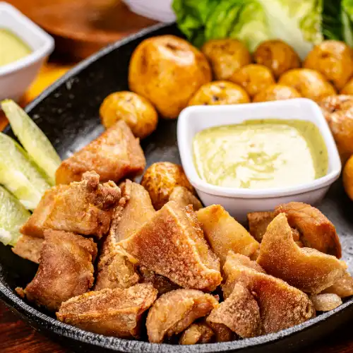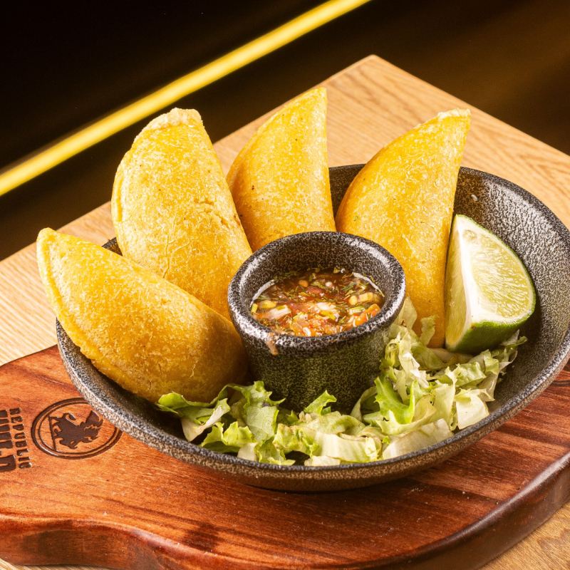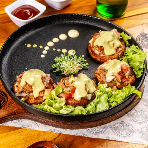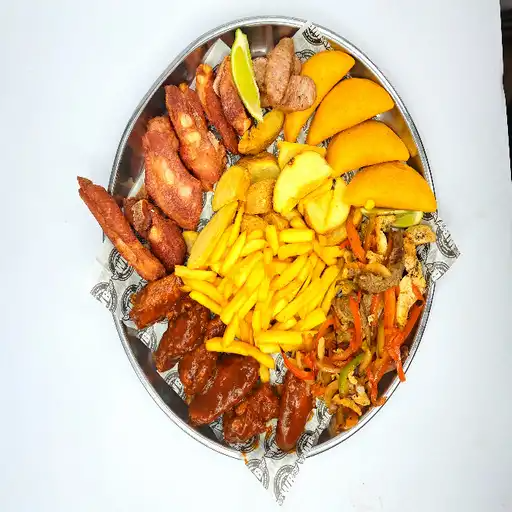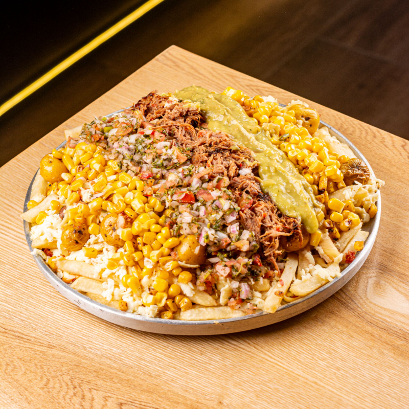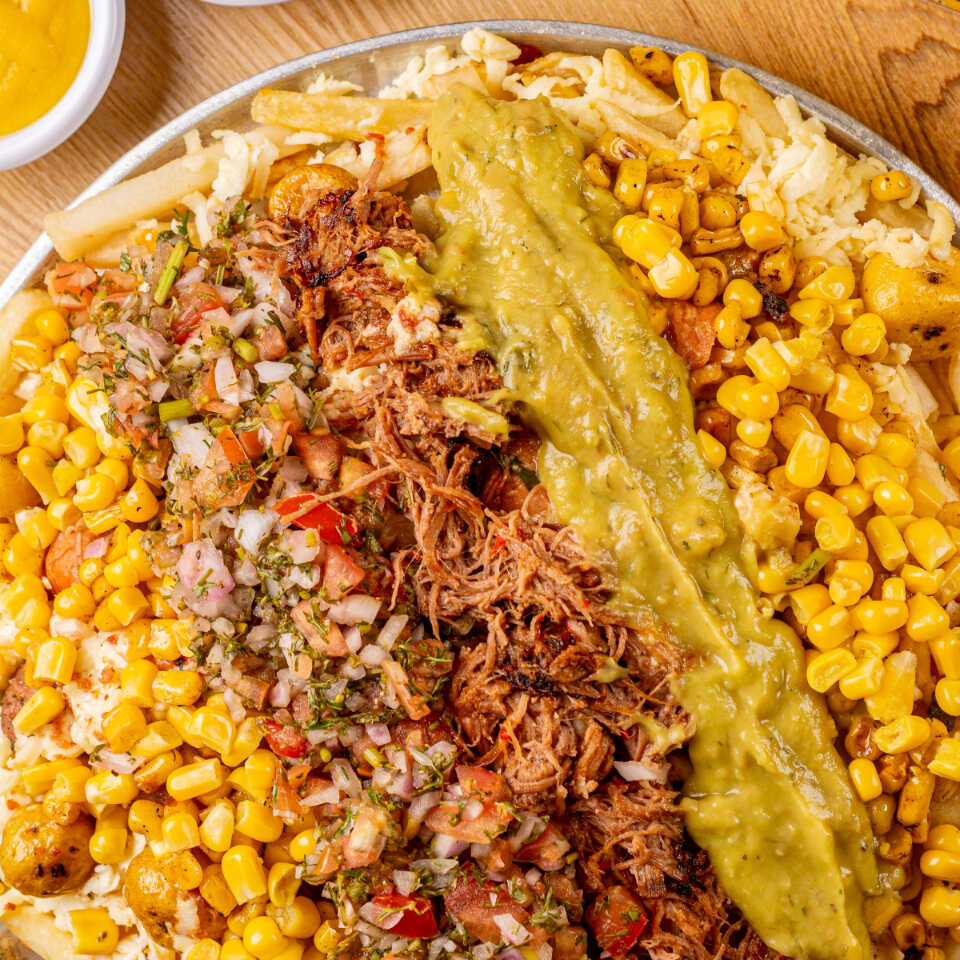 Mix de papa criolla y francesa, salchicha americana, carne desmechada, queso mozzarella, maíz tierno, guacamole, pico de gallo y salsa de la casa.