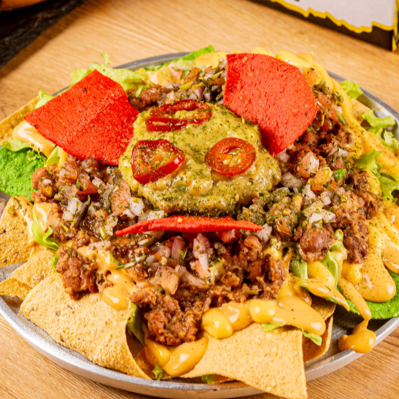 Tortillas de maíz, delicioso chili con carne molida, pico de gallo, queso cheddar liquido y jalapeños.