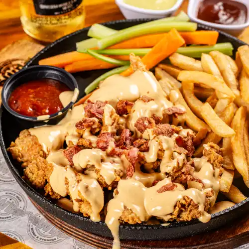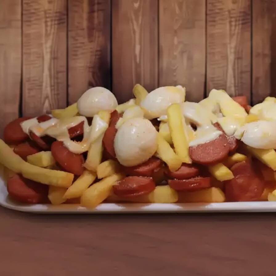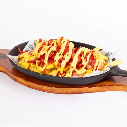 Base mixta de papa francesa y criolla, salchicha americana, chorizo, tocineta, queso mozzarella rayado, salsa showy y salsa de la casa.