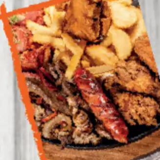 Carne y pollo en trozos, chorizo, salchicha americana, papa francesa, queso rallado, maíz tierno, papa ángel y salsa de la casa