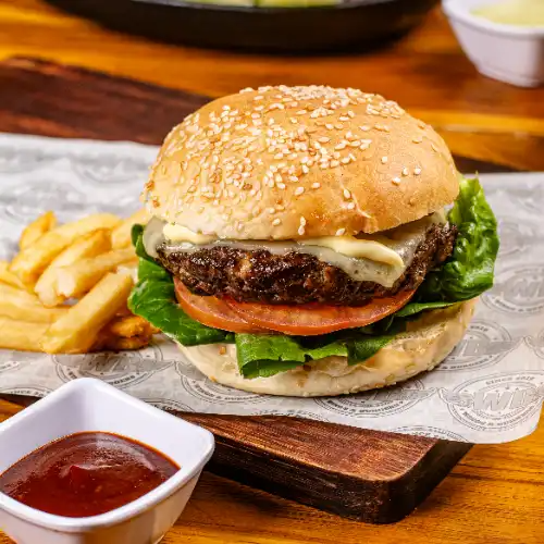 Pan brioche, carne 100% artesanal 125g a la parrilla, tomate, lechuga, cebolla, queso y salsas.