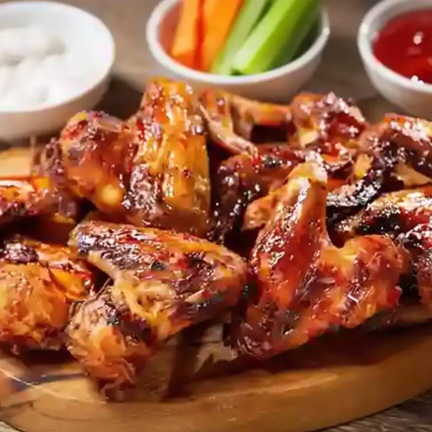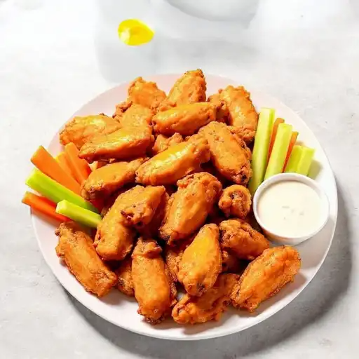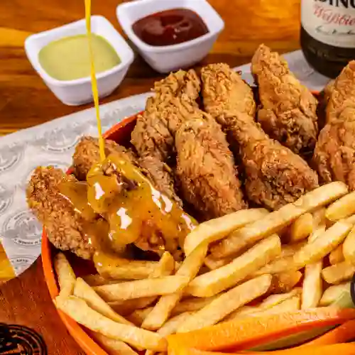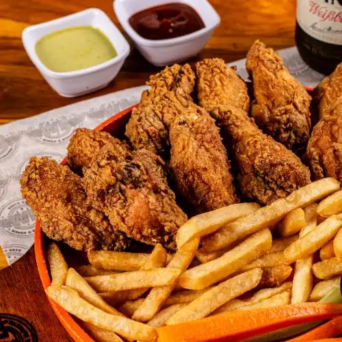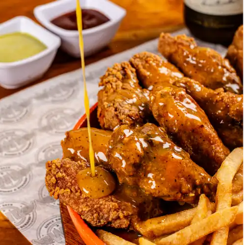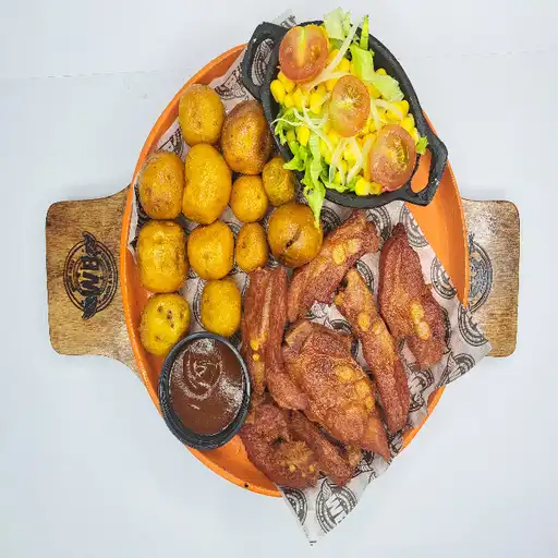 6 piezas de alas, 250gr de costilla baby bañadas en salsa bbq, acompañada de piña asada, papa francesa, apio y zanahoria, puedes elegir una salsa.
