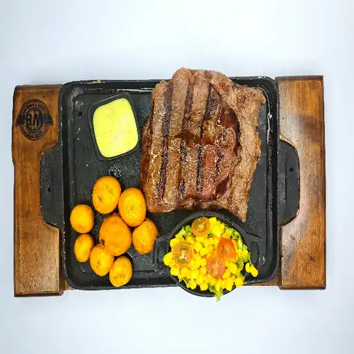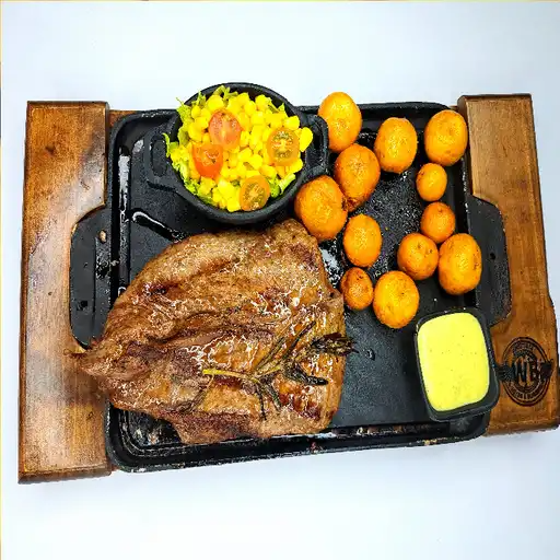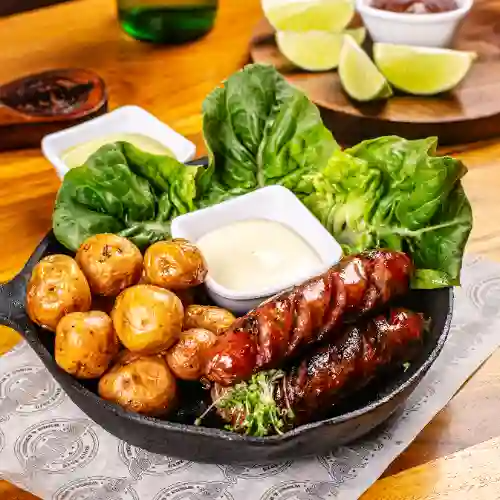 Alitas, carne, pollo, chorizo, chicharrón, costilla, chinchulines, acompañada de papa criolla, aji y guacamole.