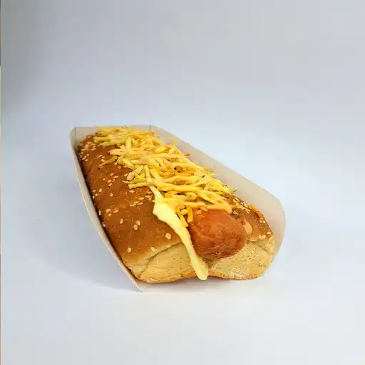 Pan bimbo, salchicha americana, carne desmechada, maíz tierno y queso gratinado.