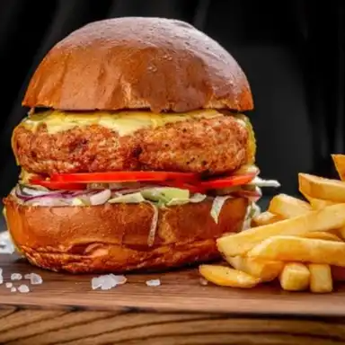 Pan brioche, pechuga 125g a la parrilla tomate, lechuga, cebolla, queso y salsas.