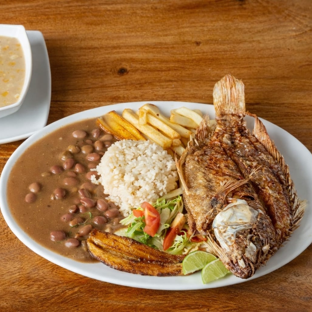 Acompañada de arroz, ensalada, entrada, tajada y papa francesa