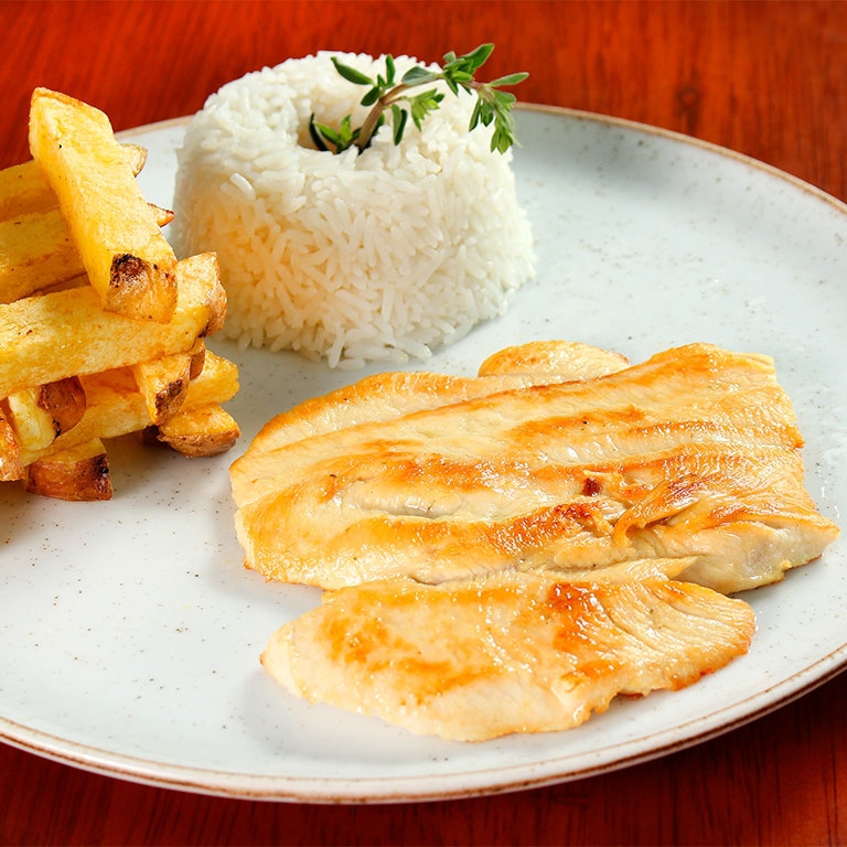 200 gr de pechuga Gratinada, papa a la francesa, arroz, ensalada, entrada, tajadas.