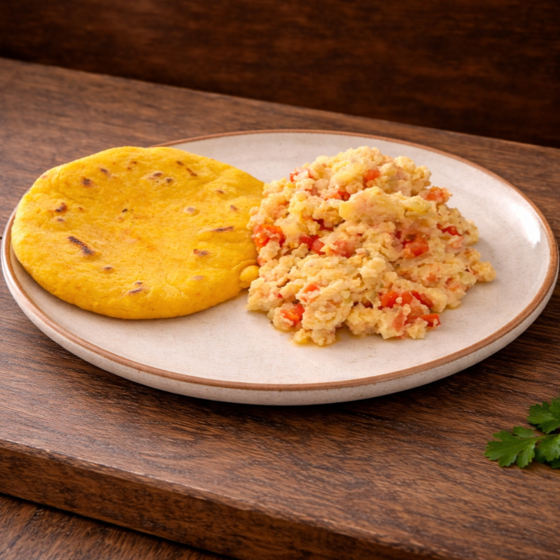 Huevos pericos con arepa, arepa de harina de maíz, huevos con cebolla y tomate.