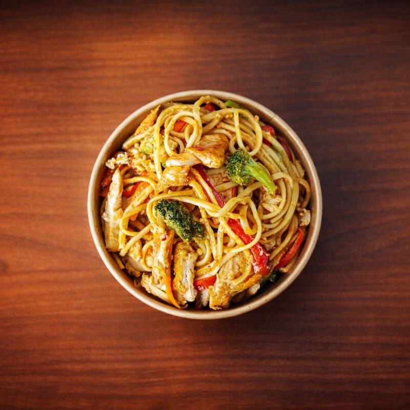 Espagueti con vegetales salteados, pimentón brócoli y zanahoria en salsa soya con proteína de pechuga o res.