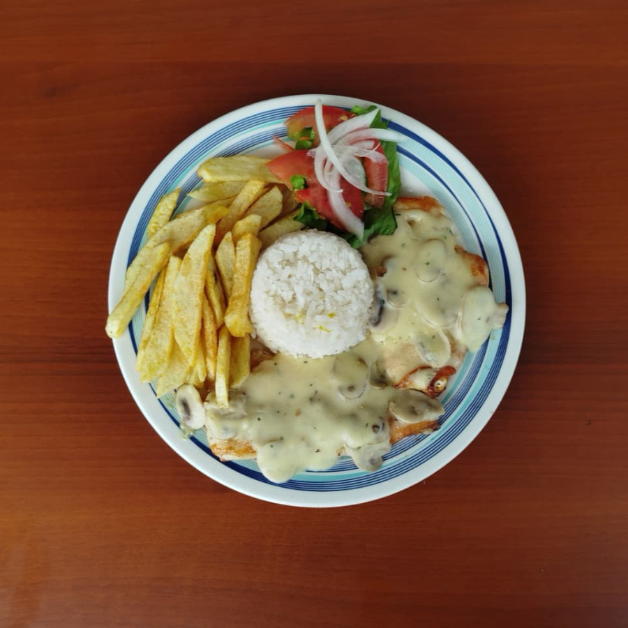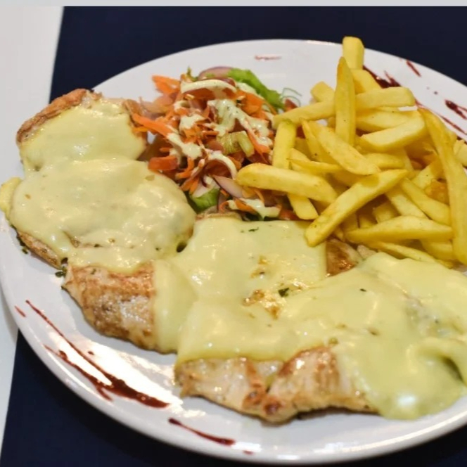 Pechuga a gratinada 250g, con queso fundido, porción de papas a la francesa, arroz blanco y ensalada de lechuga cebolla y tomate.