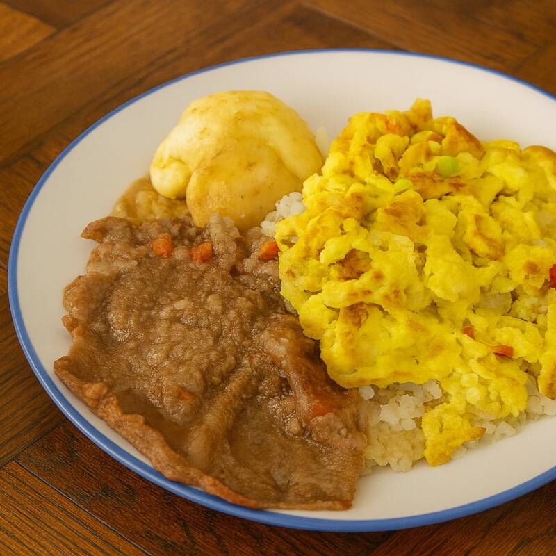Carne en bistec, huevos revueltos, 1 papa, arroz, 1 pan, bebida caliente o jugo natural en agua.