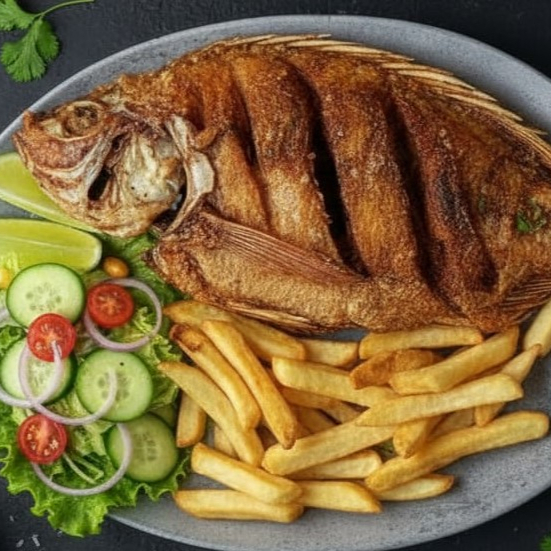 Mojarra frita 250g, acompañado de porción de arroz blanco, papas a la francesa, jugo natural y ensalada del día.