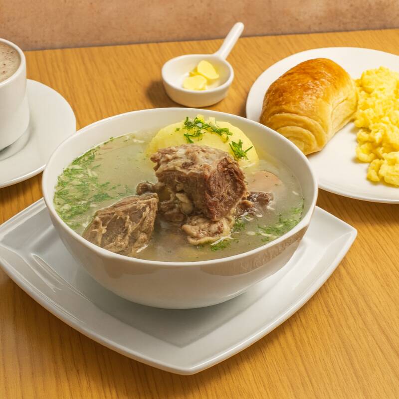 Caldo de costilla, huevos al gusto, 1 pan, bebida caliente o jugo natural en agua.