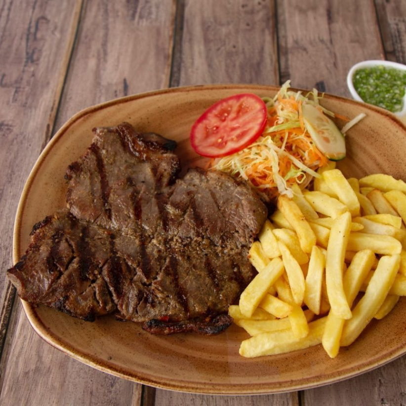 Churrasco 250g, porción de papas a la francesa, arroz blanco, y ensalada de lechuga cebolla y tomate.