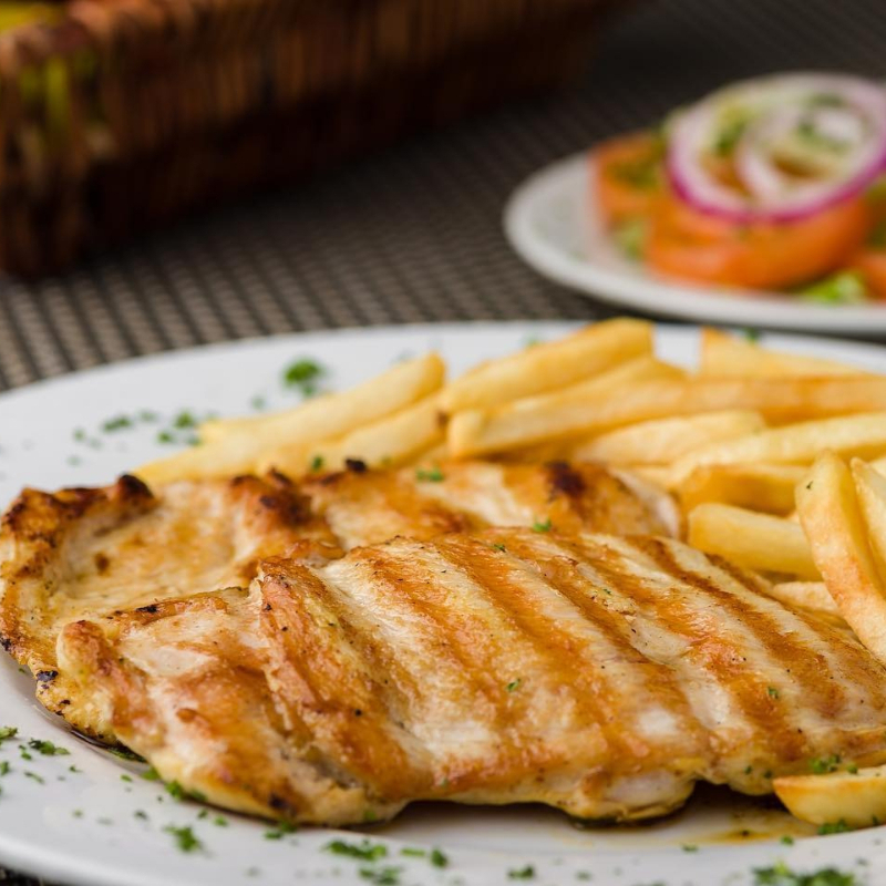Pechuga a la plancha 250g, porción de papas a la francesa, arroz blanco, y ensalada de lechuga cebolla y tomate.
