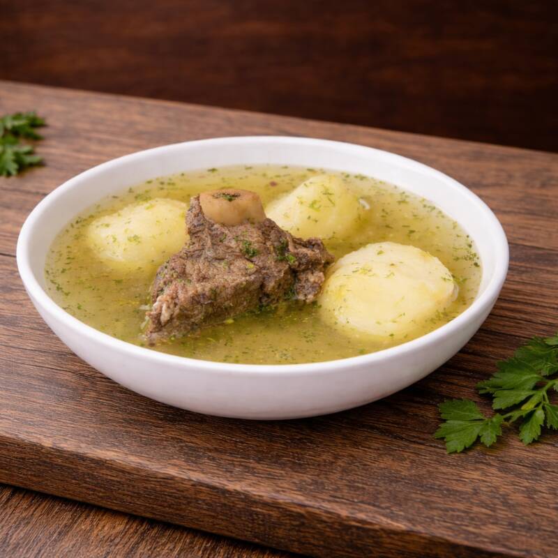 Caldo de Costilla de res, papa cilantro y cebolla finamente picado.