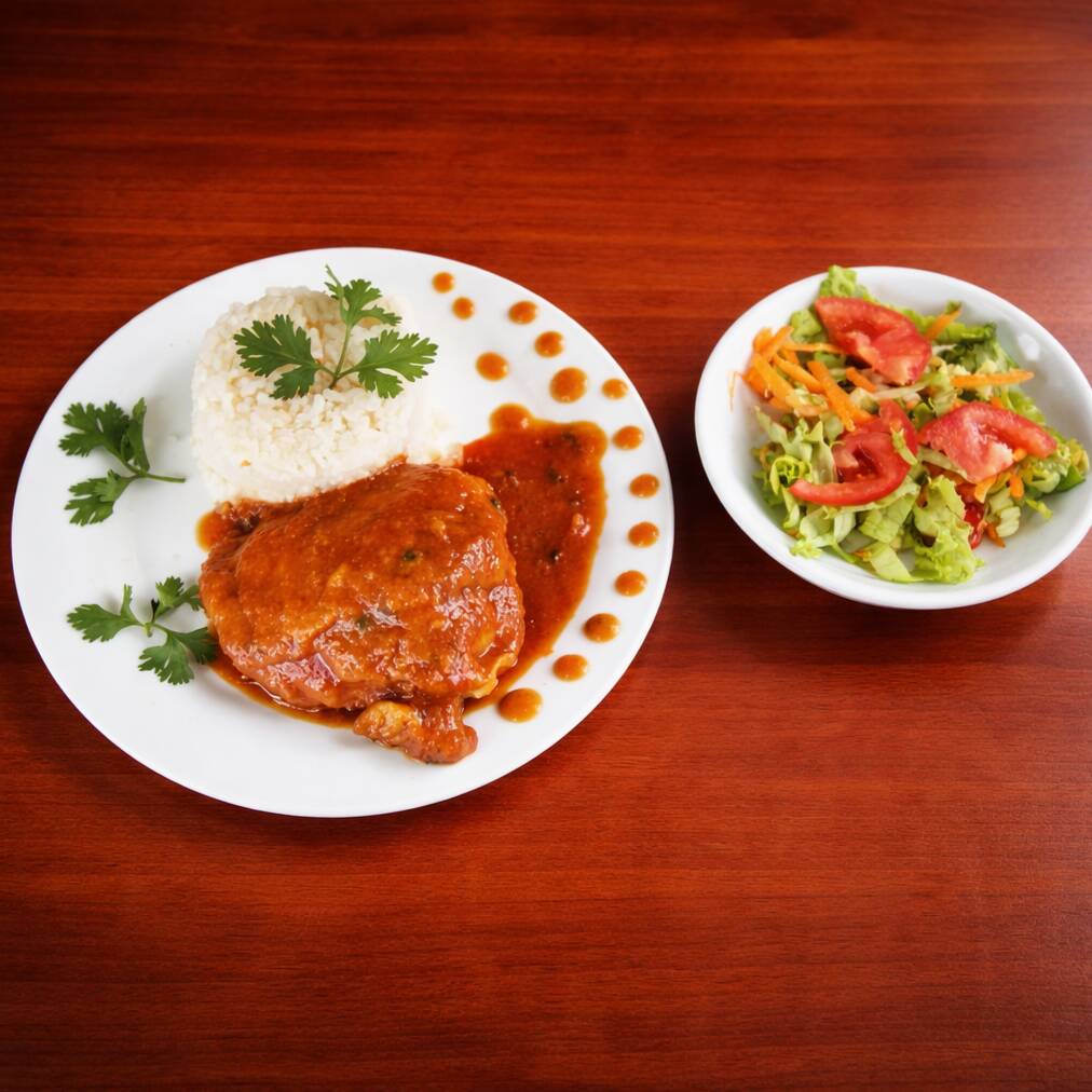 Pollo en salsa BBQ, acompañado de porción de arroz blanco, papas a la francesa, ensalada del día y jugo natural en agua.
