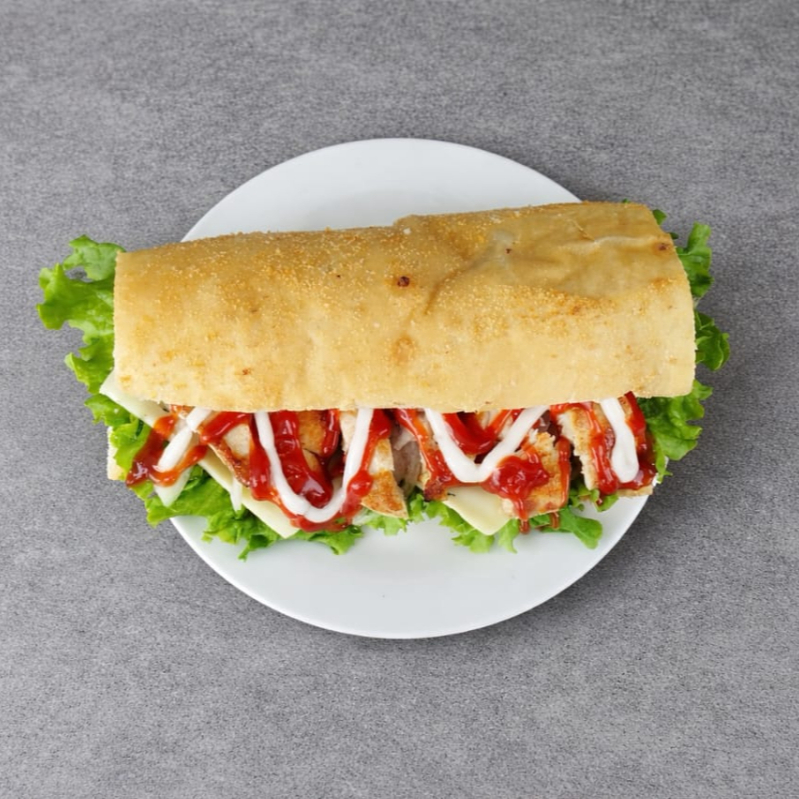 Sándwich de pechuga asada en julianas, con pan francés, queso, lechuga, tomate, cebolla, mayonesa y salsa de tomate, acompañado de una coca-cola cero 250ml.