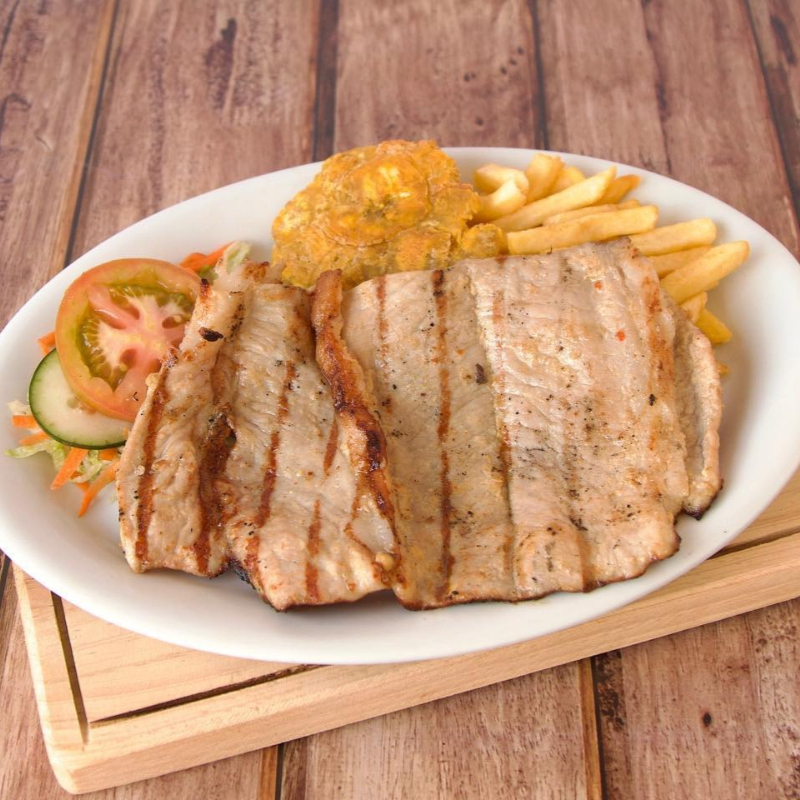 Lomo de cerdo a la plancha 250g, porción de papas a la francesa, arroz blanco y ensalada de lechuga cebolla y tomate.