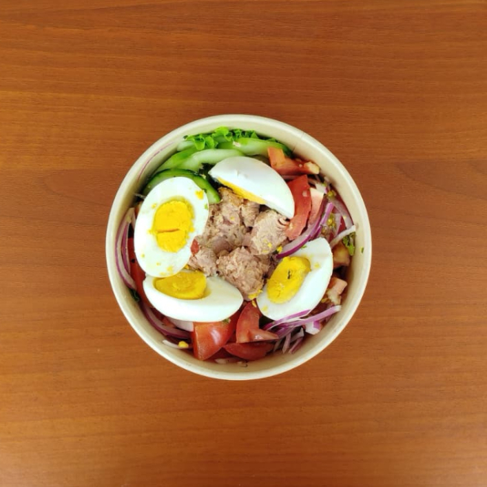 Porción de atún en aceite de 120g, dos huevos duros, cama de lechuga con cebolla, tomate y pepino en rodajas, aceite de oliva y vinagre blanco.