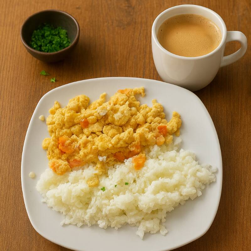 Huevos con arroz al gusto, 1 pan y bebida caliente o jugo natural en agua.
