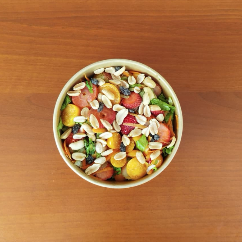 Ensalada de lechuga, zanahoria, fresas, uchuvas, un toque de maní salado y uvas pasas.