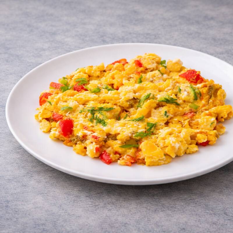 Huevos pericos con cebolla y tomate.