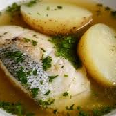 Caldo especial de pescado, con papa, cilantro y arepita, servido en taza de 24 onz