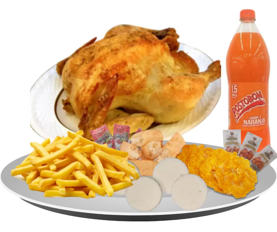 1 Exquisito Pollo Frito o Broaster + Papa Francesa + Yuca + Patacón + Arepa + Salsas + Miel y Gaseosa Familiar