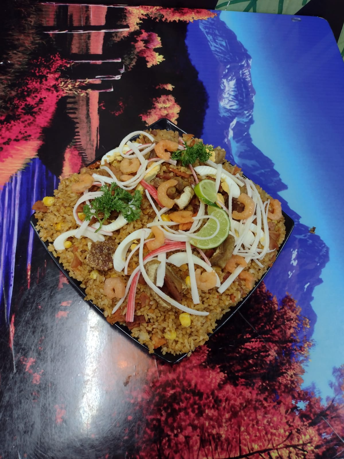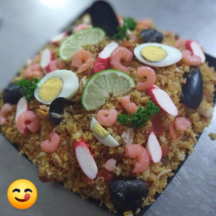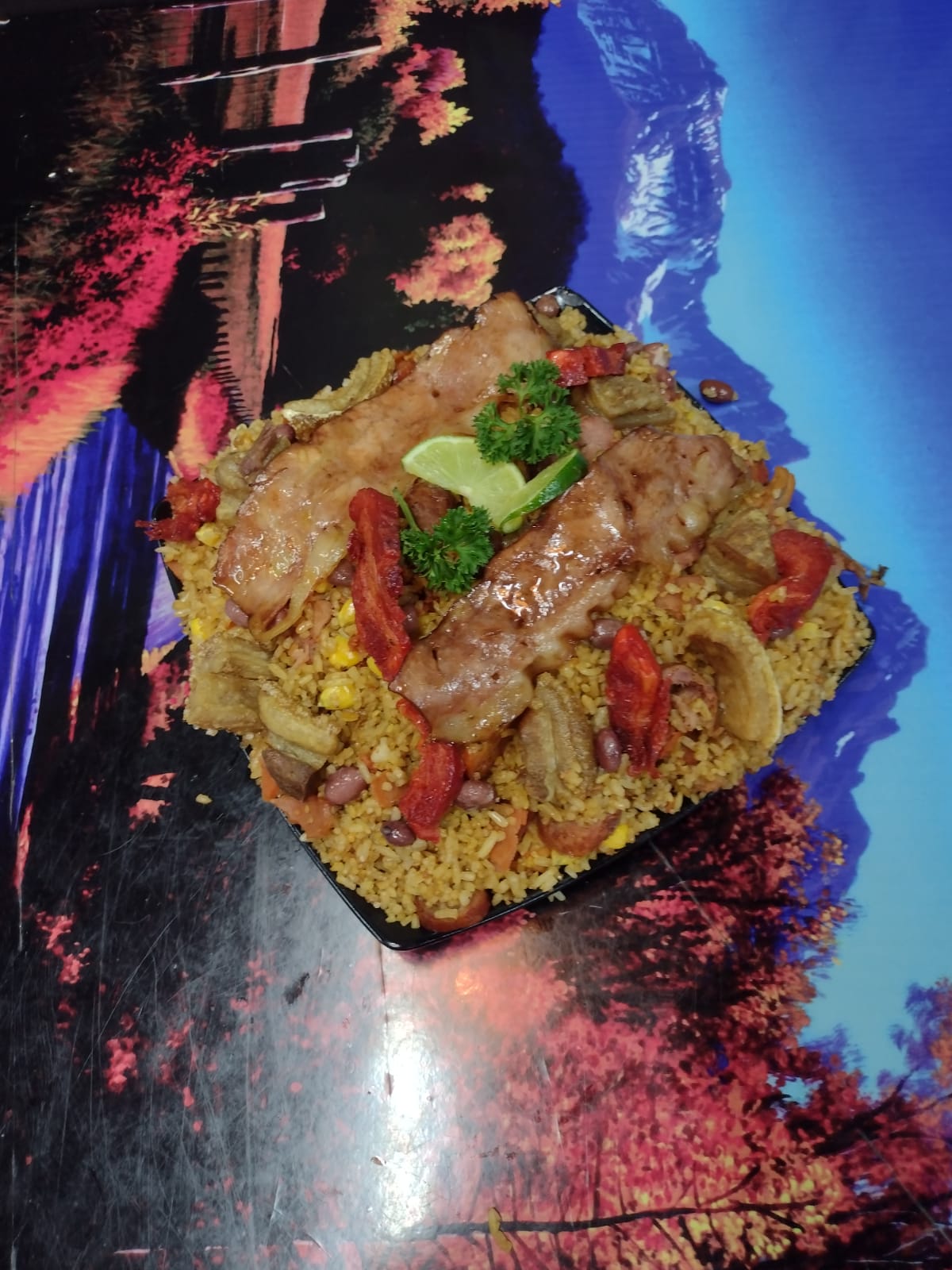 carne de cerdo , jamon ,mixtura ( pulpo ,calamar, lomitos de mojarra) salsa marinera , camaron , palmitos de cangrejo,huevo, conchas