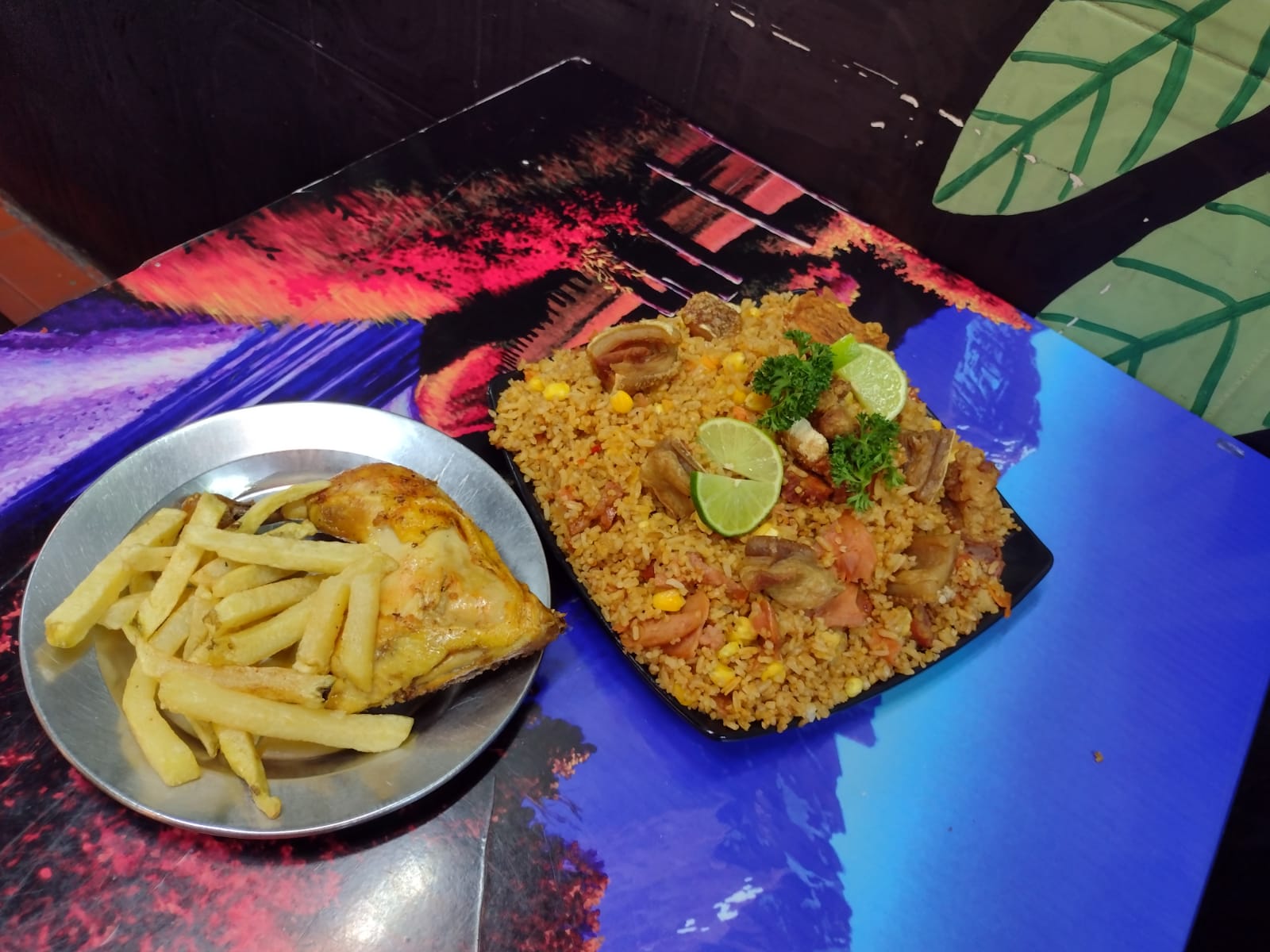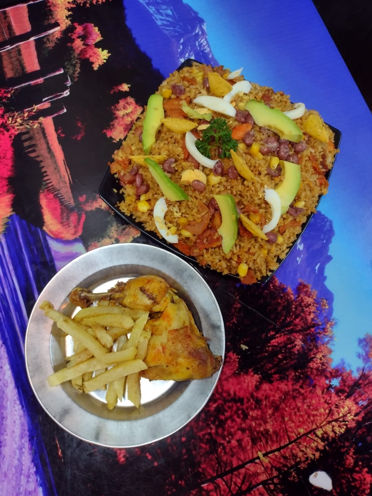 Caja Arroz Mexicano especial*1 + 1/4 Pollo Frito (pierna pernil)*1 + Porción de Papas francesas*1 + Salsas de la casa*1