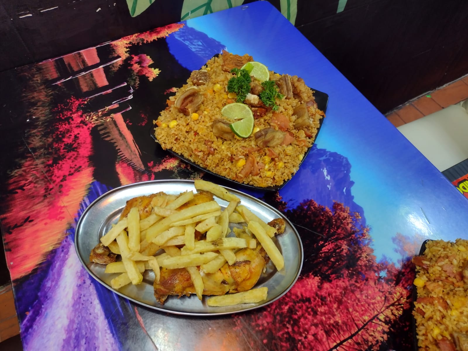 Porción de Papas francesas*1 + Salsas de la casa*1 + Caja Arroz Mexicano especial*1 + 1/4 Pollo Frito (pierna pernil)*2