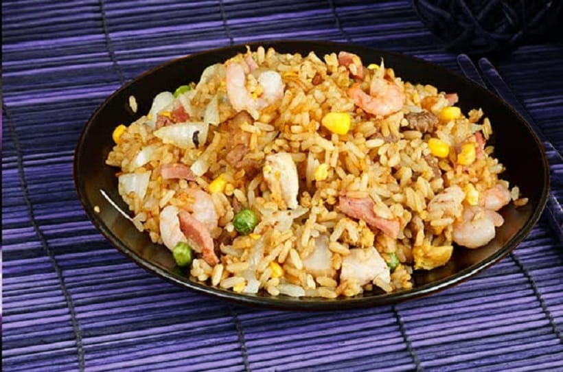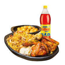 1caja de arroz chino con jamón, cerdo, raíces chinas, pollo desmenuzado + 1/2 pollo en pierna pernil+ gaseosa 1.5 LT.