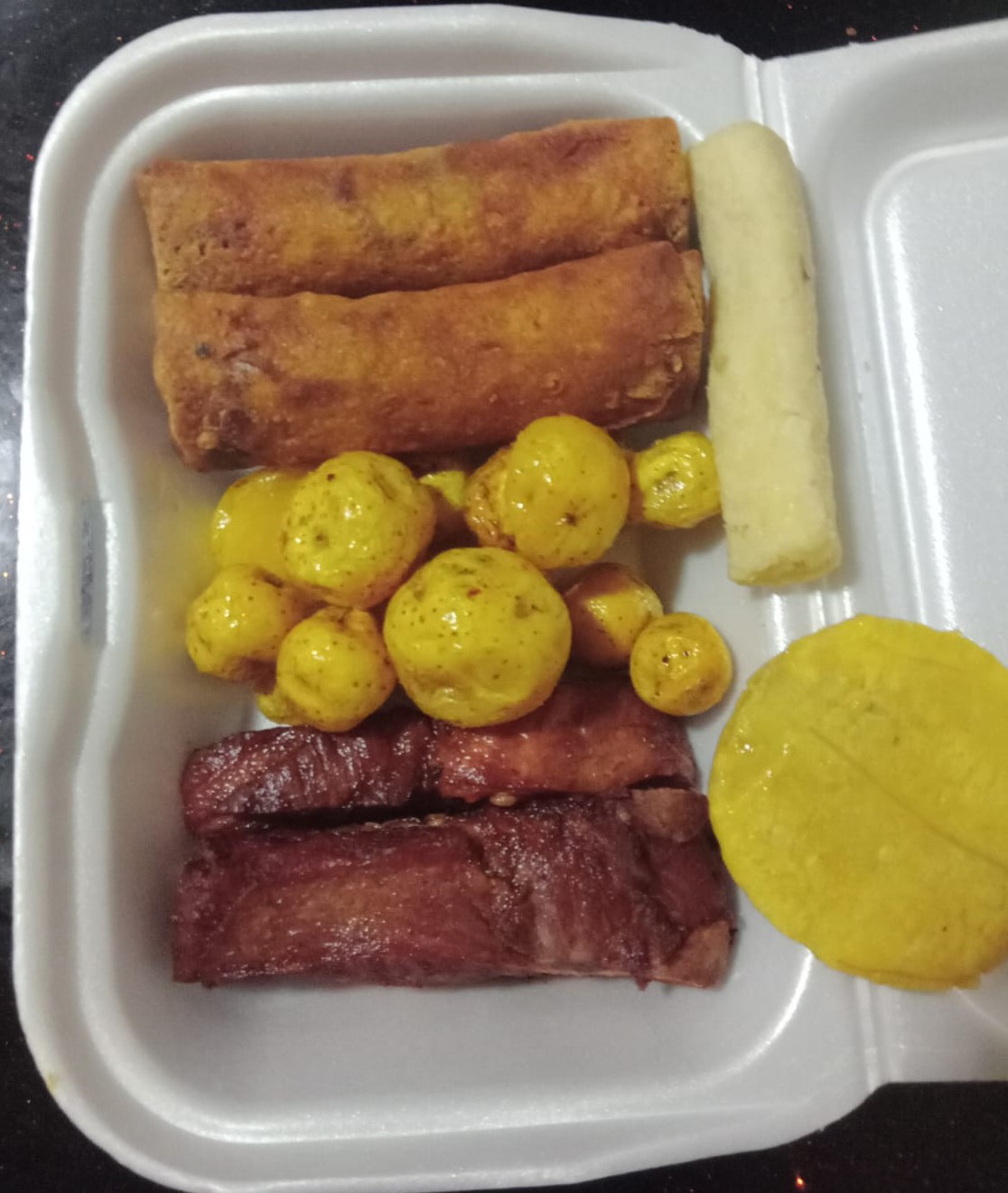 2 Rollitos Chinos (primaveras), 2 Costillas de cerdo Ahumadas, Papa Criolla, Croquetas de Yuca y Patacón