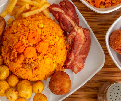 Arroz paisa con: Chicharrón, maíz tierno, plátano maduro, salchicha ranchera, chorizo, pollo desmenuzado + 4 rollitos de verdura (Primaveras)