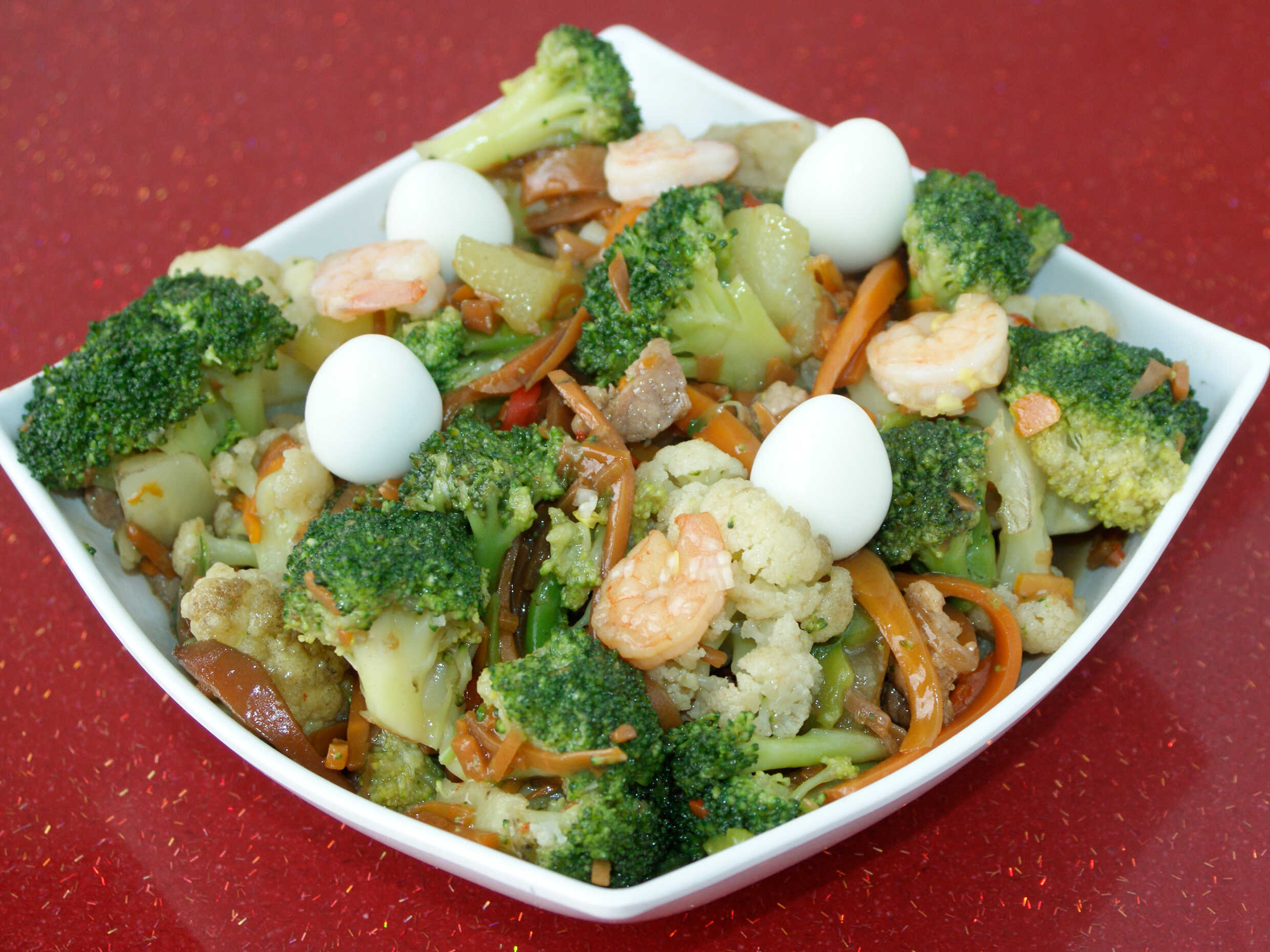 Verduras como brócoli, coliflor, zanahoria, calabacín, camarón, huevos de codorniz tilapia calamar palmitos y trocitos de cerdo con pechuga